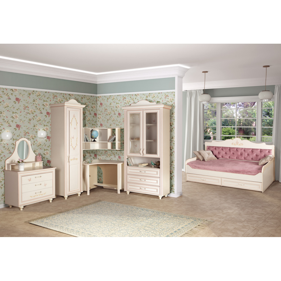 Корпус: ДСП, декор – кремовый белый. Основание кровати – ламели