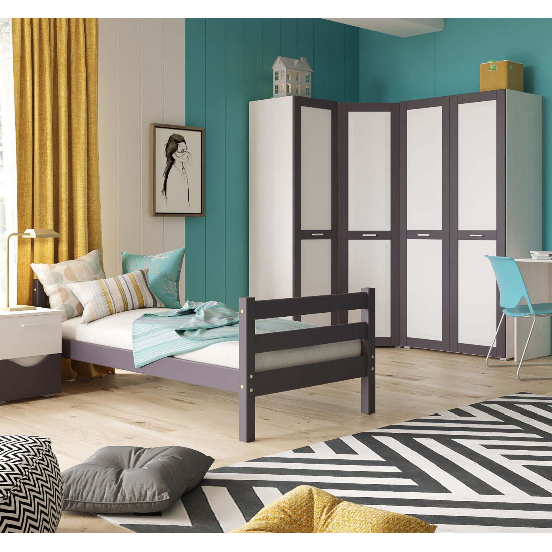 Кровать выполнена из массива дерева, может комплектоваться выкатными ящиками и аксессуарами из текстиля. Отделка выполнена эмалью AqaLAC с добавления красителя цвета "Лаванда".